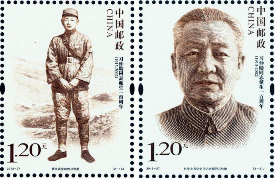 中国邮政于2013年10月15日发行《习仲勋同志诞生一百周年》纪念邮票,全套邮票两枚,面值2.40元。包括两当兵变前的习仲勋、 任中央书记处书记时期的习仲勋邮票。